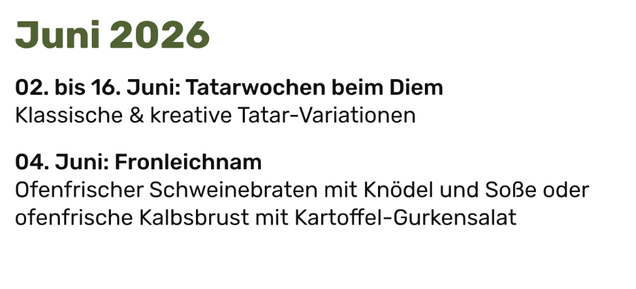 Johannes Diem, der Küchenchef des Hauses Hotel Diem – Krumbach verwöhnt Sie mit regionalen Köstlichkeiten aus einer wechselnden, saisonalen Speisekarte. Das Restaurant legt großen Wert auf die Frische der Zutaten und verwendet überwiegend regionale Produkte wie Gemüse, Salat und Obst sowie Fleisch aus der hauseigenen Metzgerei.