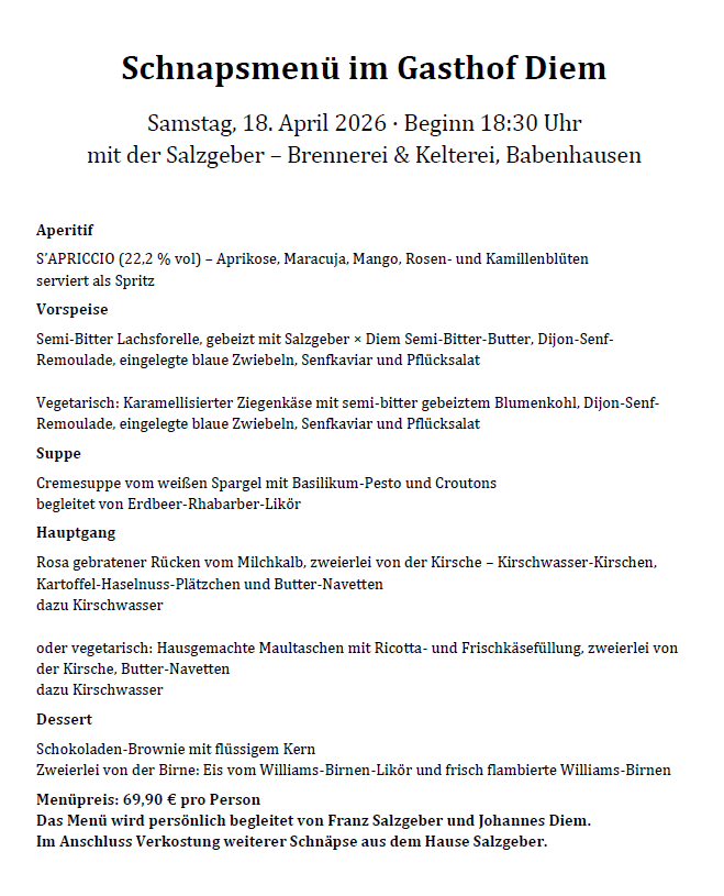 Gemeinsam mit der Salzgeber Brennerei & Kelterei aus Babenhausen laden wir euch zu einem fein abgestimmten Menü mit edler Schnapsbegleitung ein.