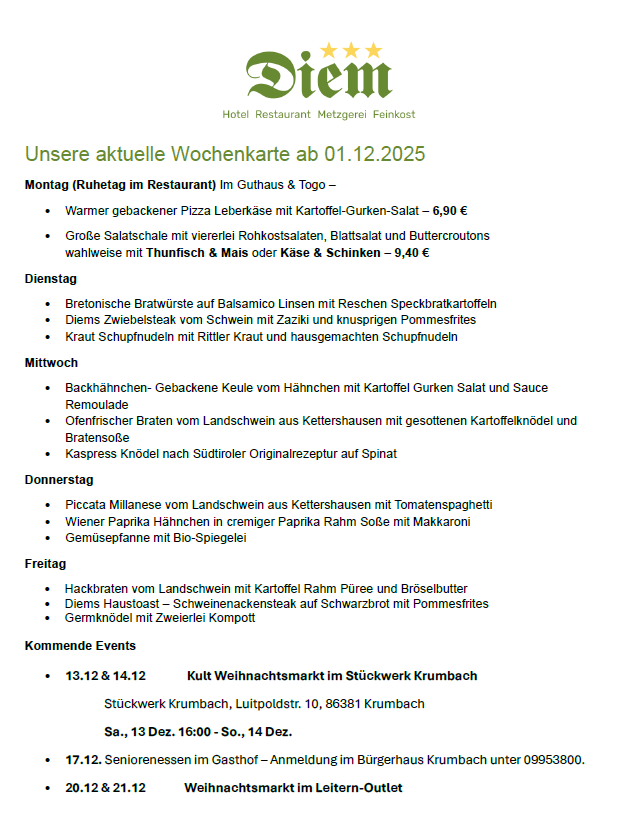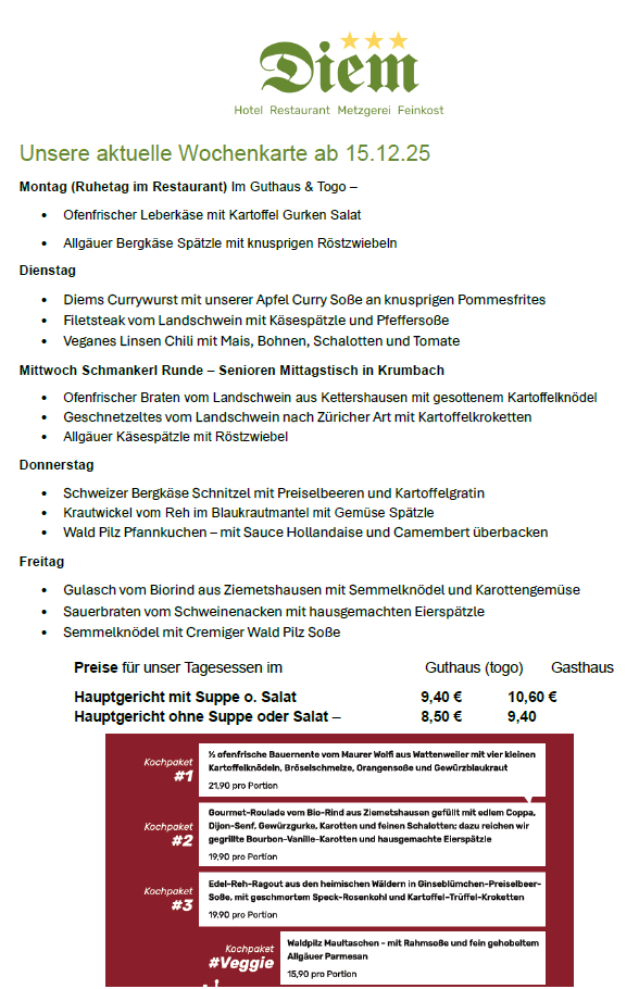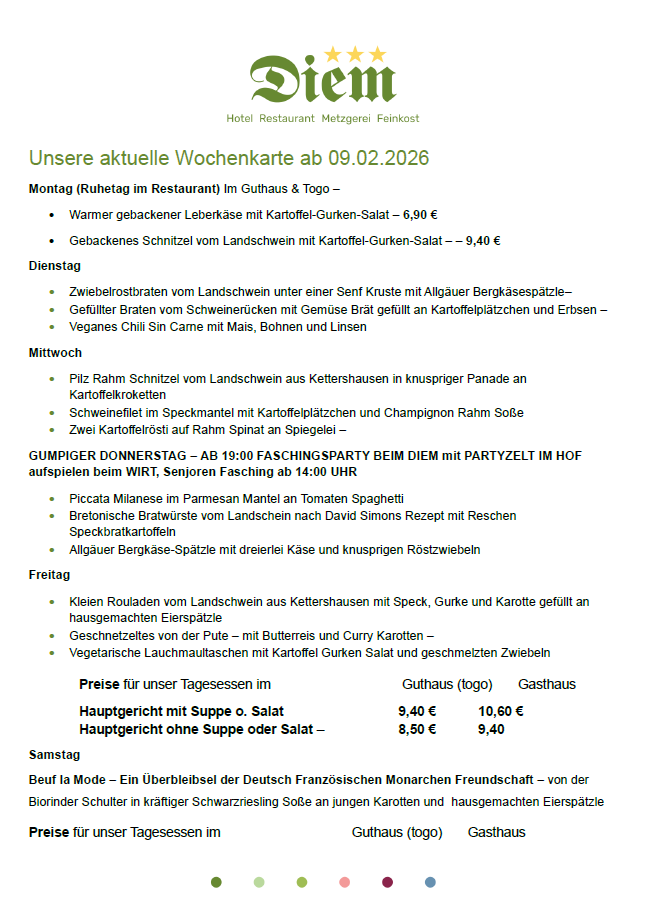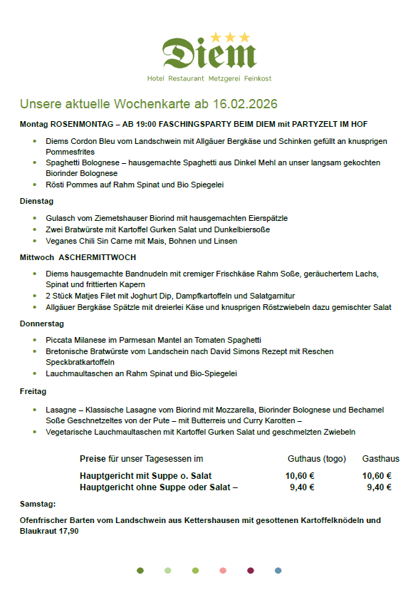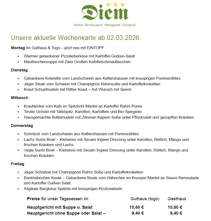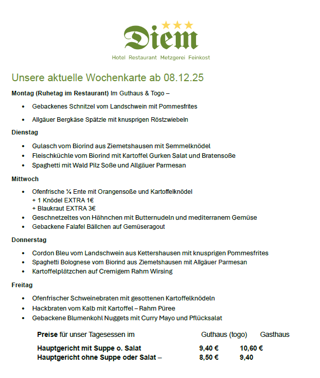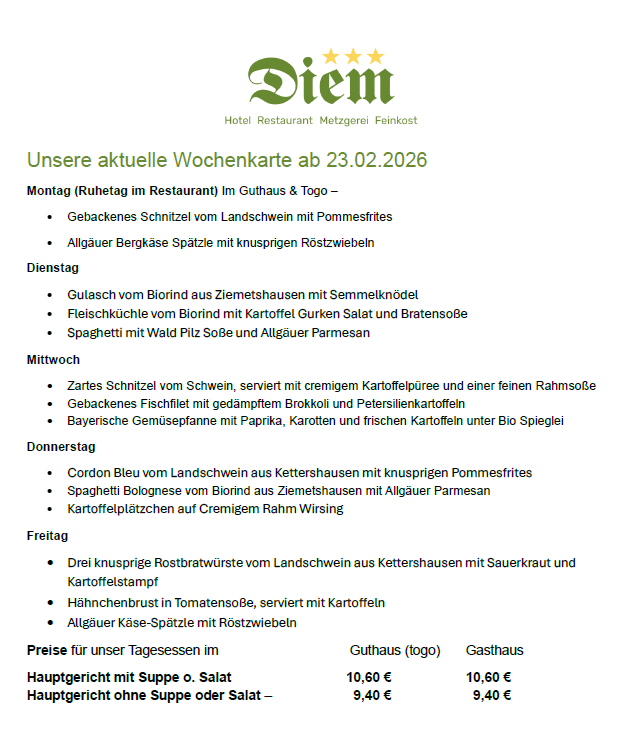 Bitte beachtet, dass die Angebote auf unseren Wochenkarten variieren und nur für die jeweiligen Wochen gültig sind. Gerichte von vorhergehenden Wochen sind leider nicht bestellbar.