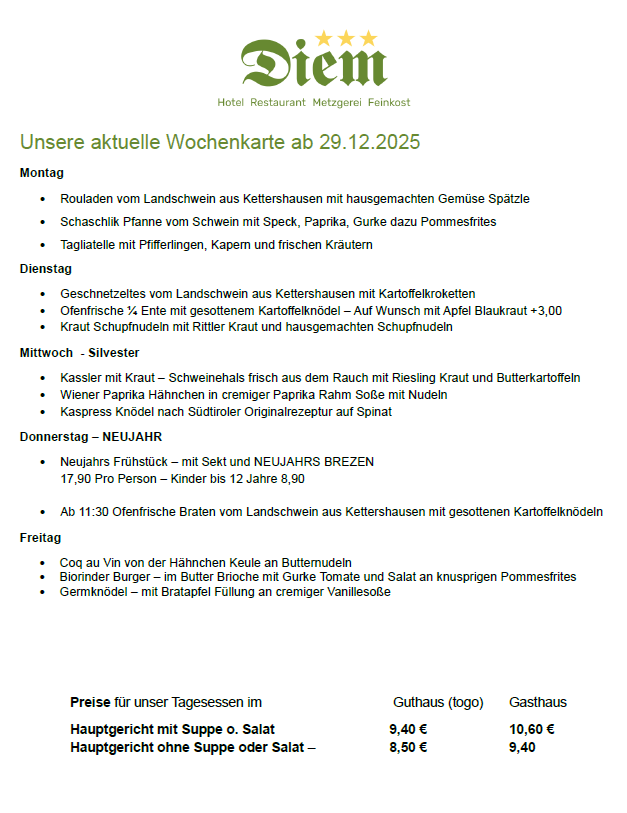 Unsere Wochenkarte gilt Werktags am Mittag, sowie für die wechselnden Wochenendgerichte den gesamten Tag zu unseren gewohnten Öffnungszeiten.